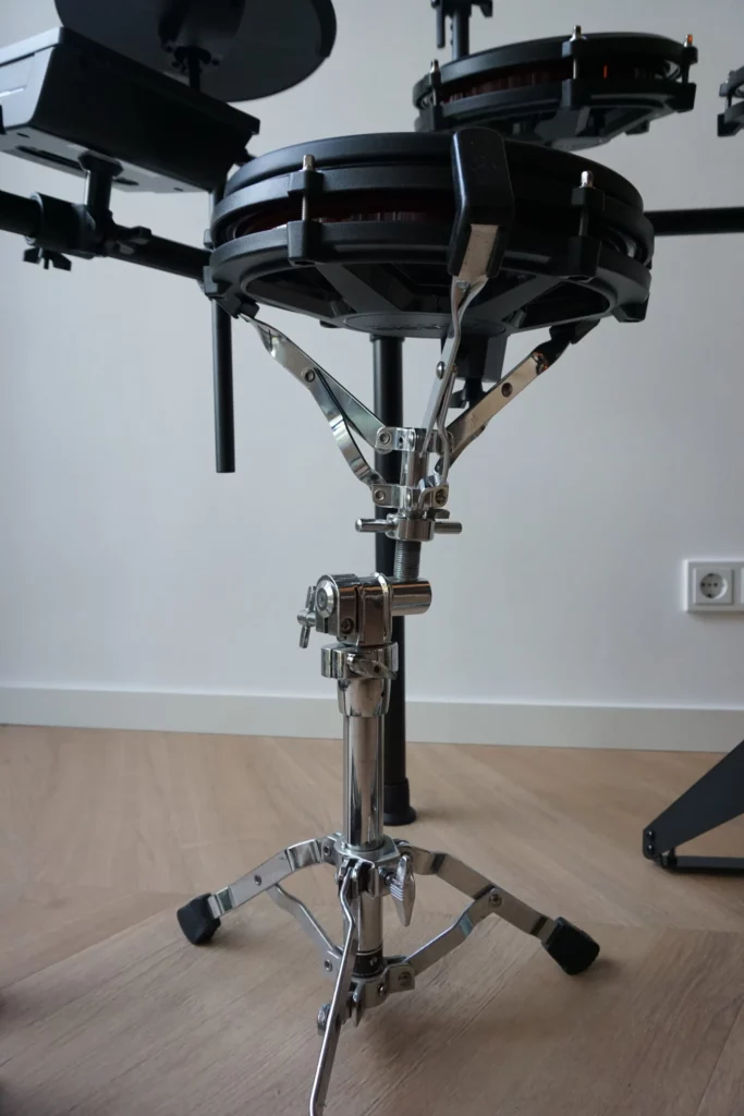 Durch die Montage des Snare-Pads auf einem separaten Snare-Ständer nehmen Sie es vom Rack ab und verhindern die Übertragung von Vibrationen über den Rahmen. Ein Snare-Ständer ist ein dreibeiniger Ständer, den du auch für akustische Trommeln verwendest. Dies sorgt für eine stabile, stabile Basis, unabhängig vom Rest des Schlagzeugs.