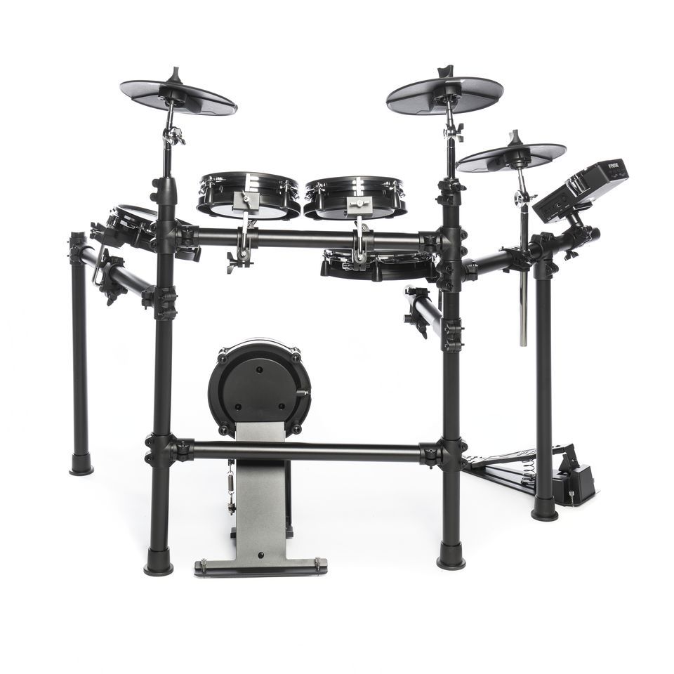 The kit consists of 3 toms (mesh), 1 snare (mesh), 3 cymbals (incl. hi-hat) and a kick pad with kick pedal. The latter is a pleasant advantage and plays much nicer than a kick controller.